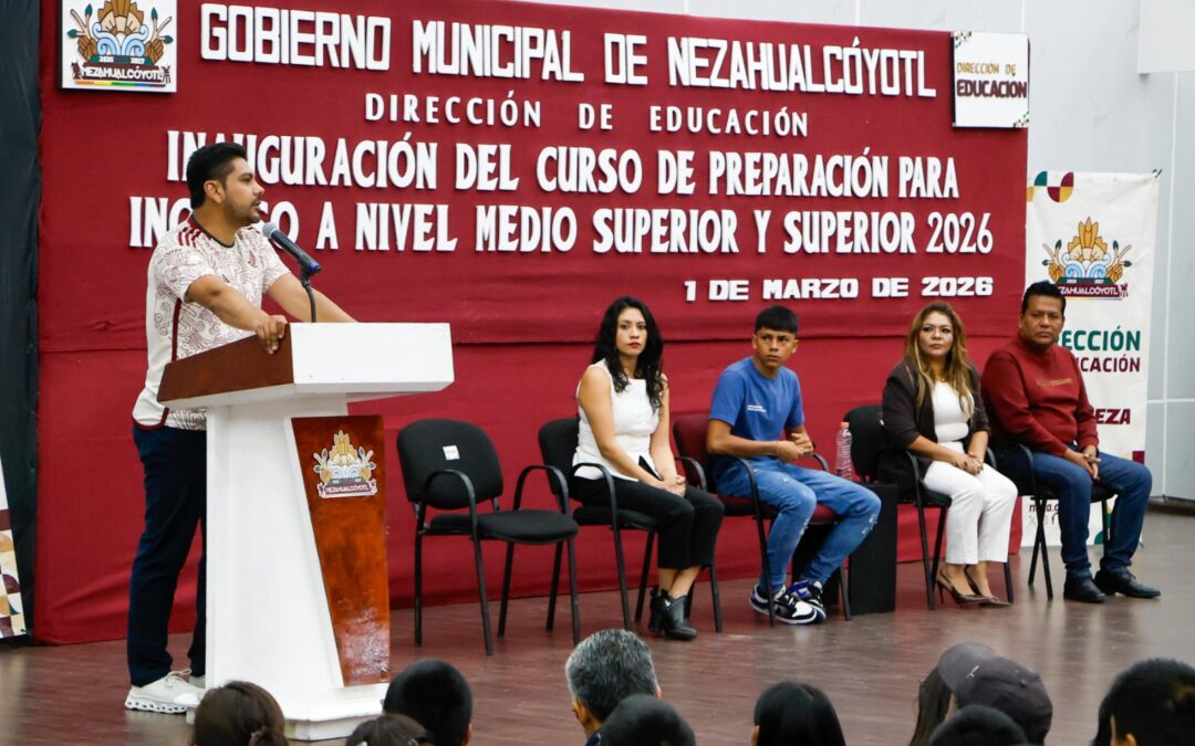 Nezahualcóyotl, 01/03/2026. El Presidente Municipal de Nezahualcóyotl, Adolfo Cerqueda Rebollo, encabezó la inauguración del Curso de Preparación para Ingreso a Nivel Medio Superior y Superior 2026, en el que participarán 2 mil estudiantes, en modalidad de fines de semana y entre semana, con horarios matutinos y vespertinos.